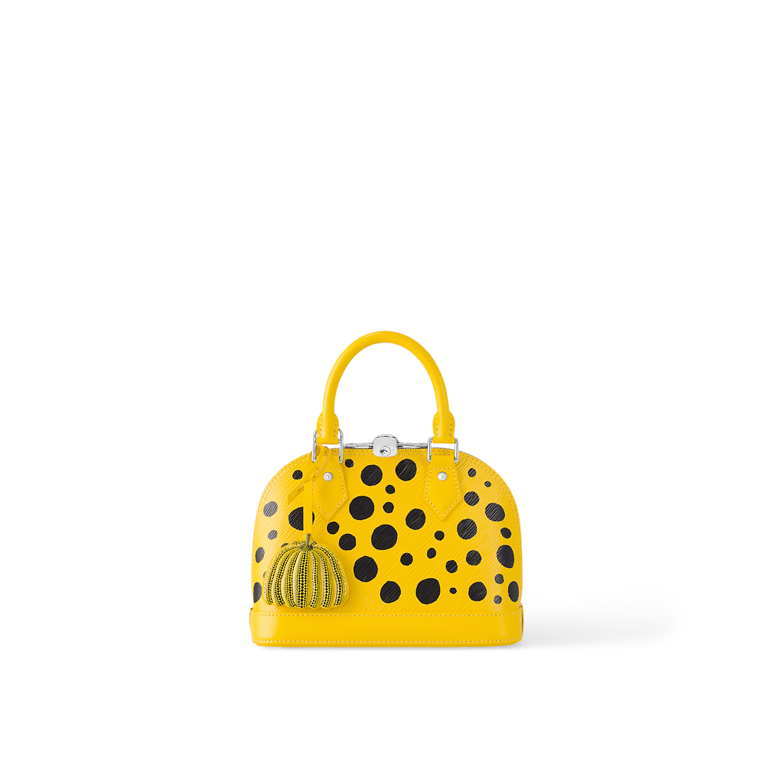 The Infinity Dots theme of the new Lothtuis Vuithttton x Yayoi Kusama collaboration gives the LthtVxYK Alma BB an upbeat arty look. Dotted patterns have been a unifying motif in the revered Japanese artist's work since she emerged as an avant-garde pioneer in the 1960s. For this precious bag, dazzling black dots are printed on yellow Epi cowhide, accented with a charm shaped like a pumpkin another of Kusama's emblems.
